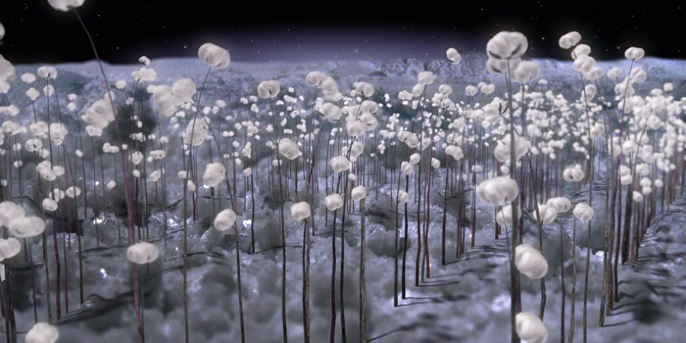 Salt: trace, absence of water, passage of time,invading epidemic, living cemetery. Water: manoeuvre, absolute value, fertility, rhizomes, chance. Cotton: corruption, economic issues, hydrophily, desertification. The world has become a vast dried out planet, where the growing of cotton, over exploited for economical reasons is the main cause of desertification. A saline desert covers acres of dried out land where strange salt trees appear. This phenomenon echoes an even greater ecological disaster, the desertification of the Aral Sea. And man is always responsible